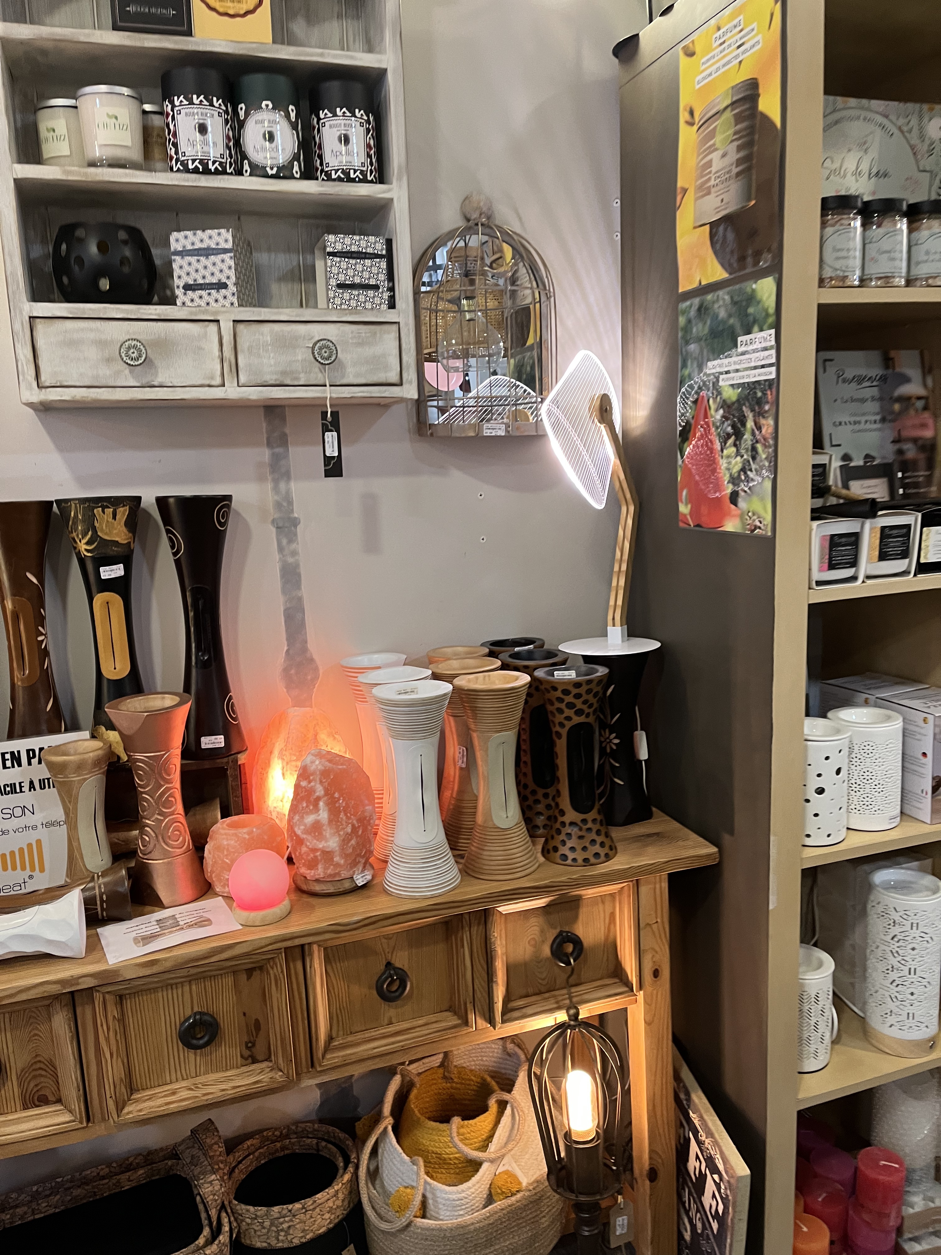 Accueil sympathique belle boutique beaucoup d objets déco, bougie, huile essentielle en tout genre, beaux couteaux, mobilier déco... restauration de mobilier et dépôt de colis boutique agréable